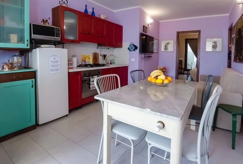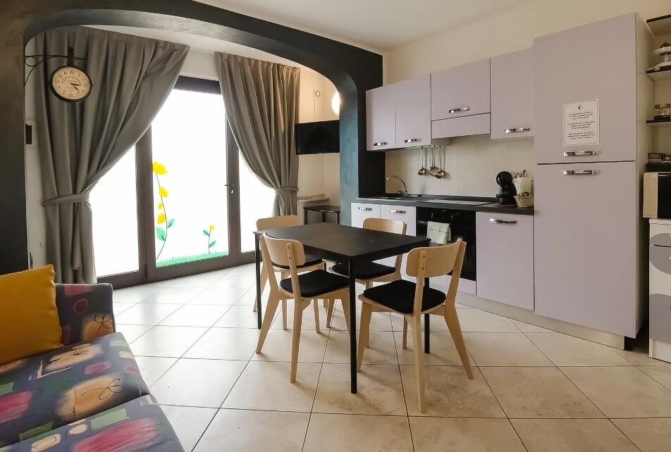 La cucina è fornita di elettrodomestici, utensili e biancheria ed è aperta sul salotto con divano tre posti e TV satellitare.