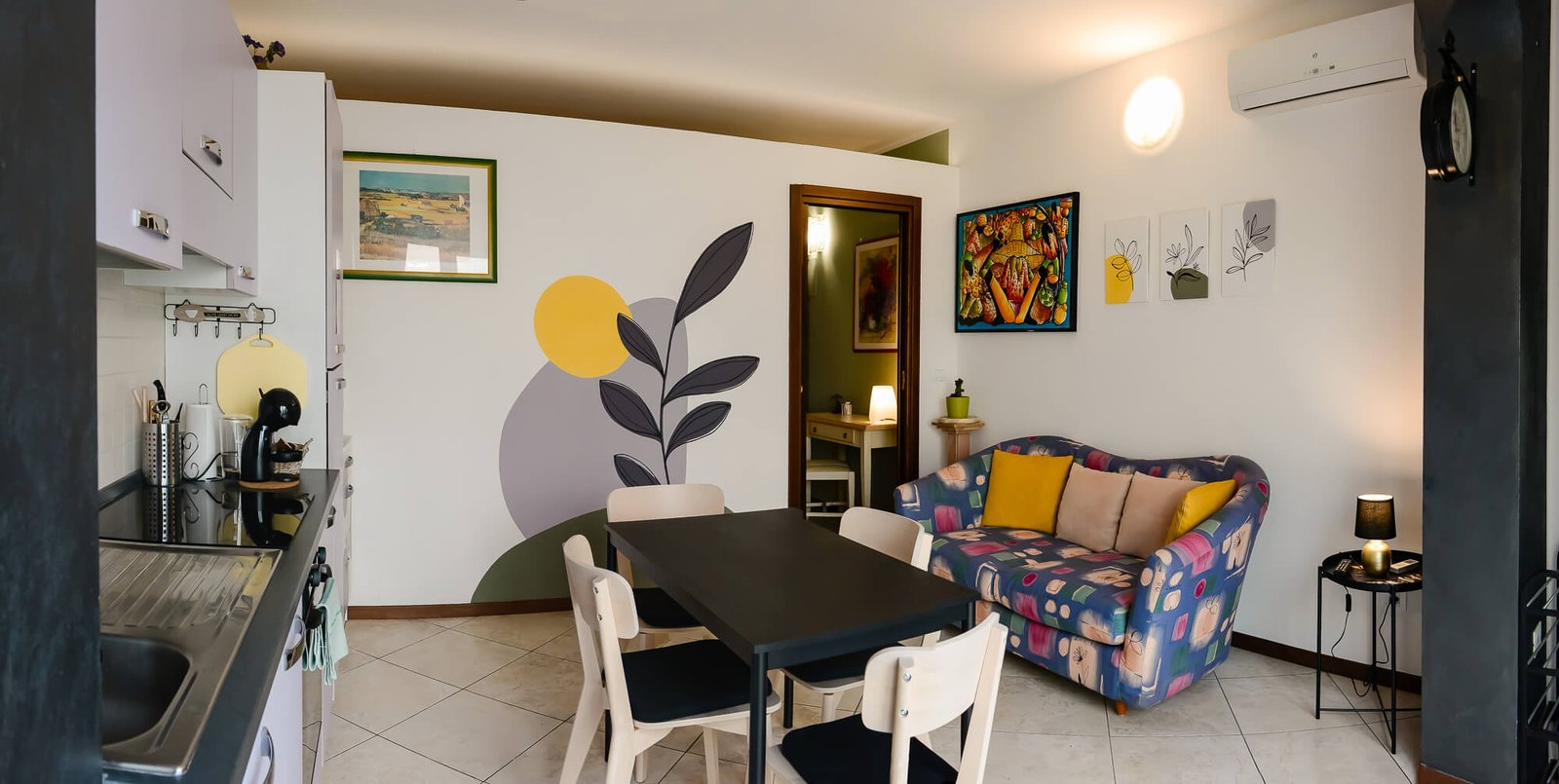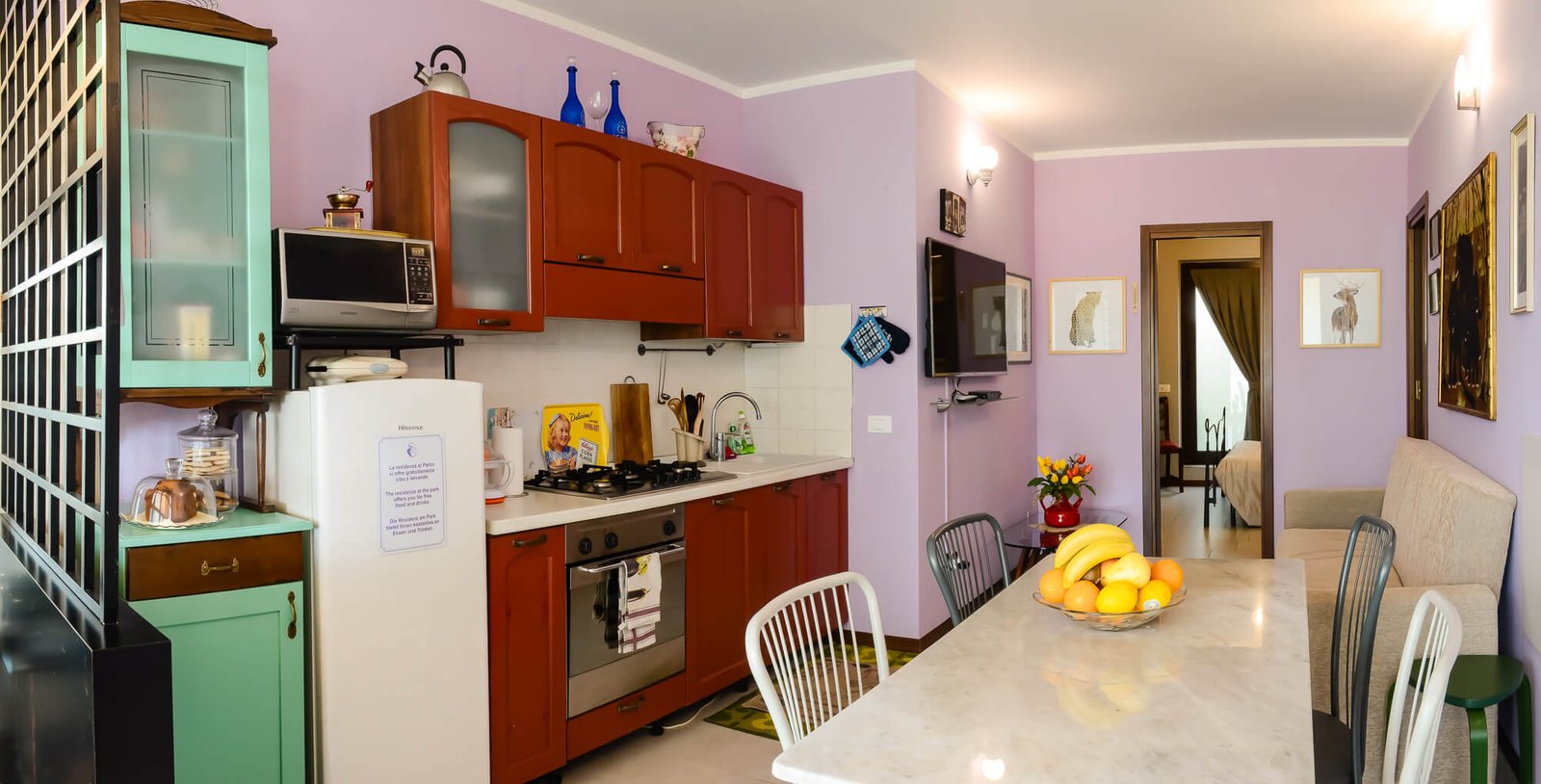 L’area esterna introduce alla zona giorno: piccolo ingresso, tende oscuranti, cucina dotata di elettrodomestici, utensili e con zona salotto, divano e TV.